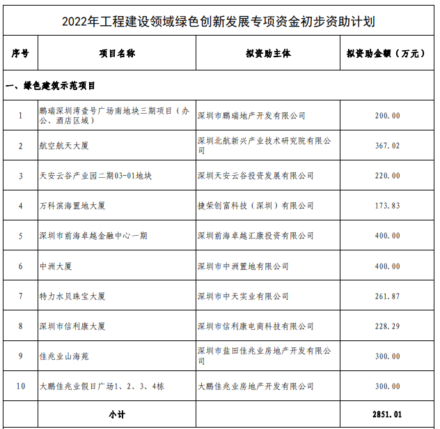 深圳市住房和建設局關于2022年工程建設領域綠色創(chuàng)新發(fā)展專項資金初步資助計劃的公示